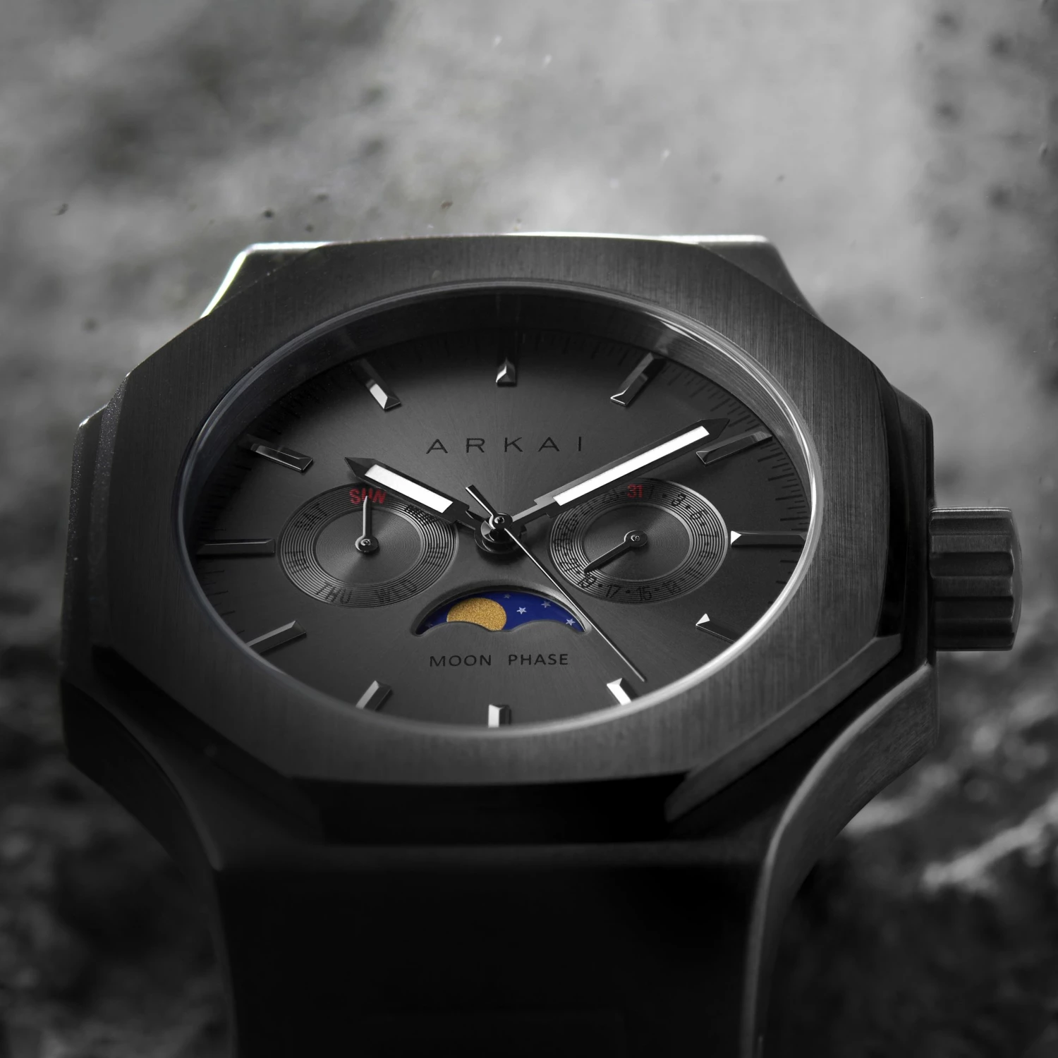 From the recessed sub-dials that indicate the date and weekday, to the moon phase complication that is the star of the gunmetal-colored dial, the sapphire crystal protects them all.