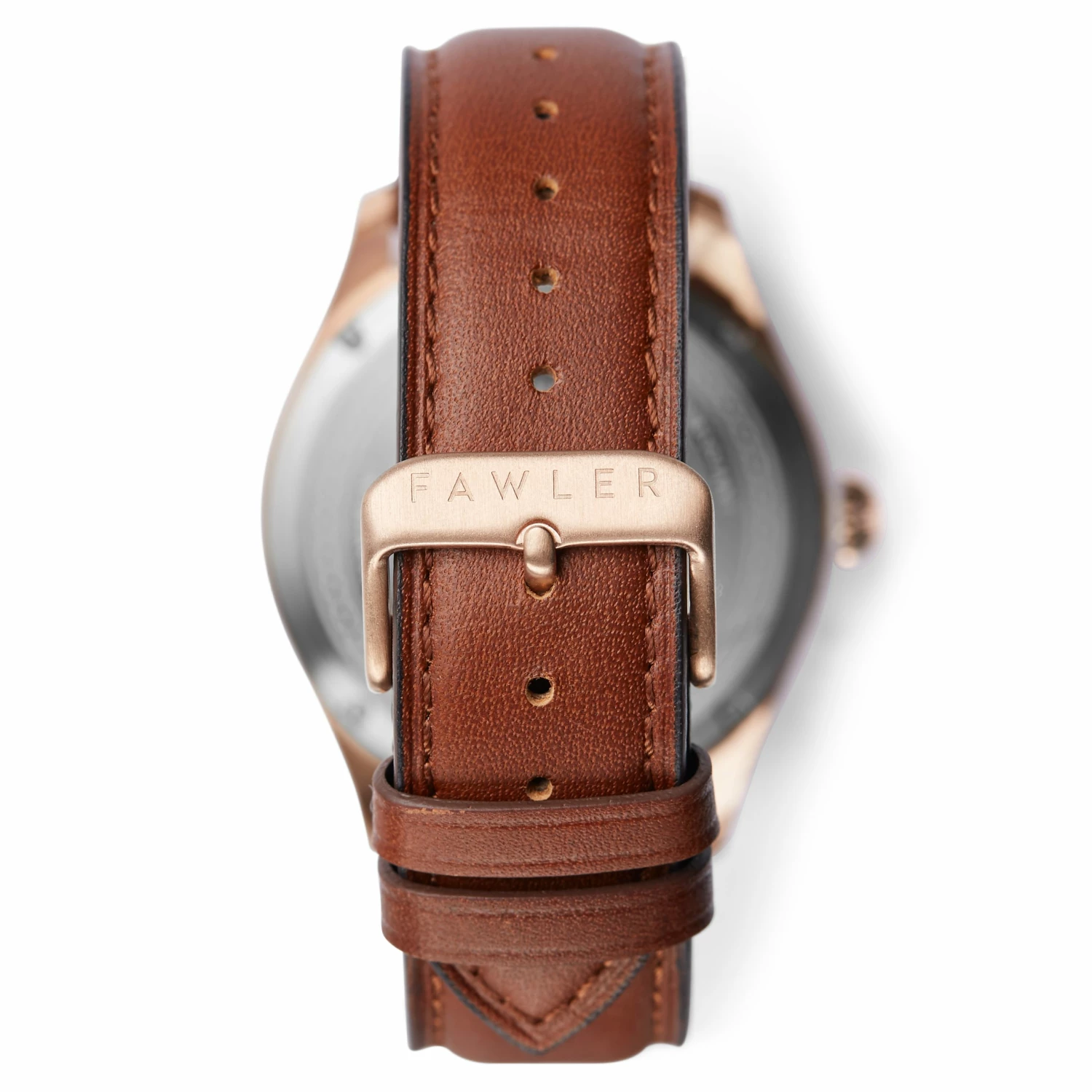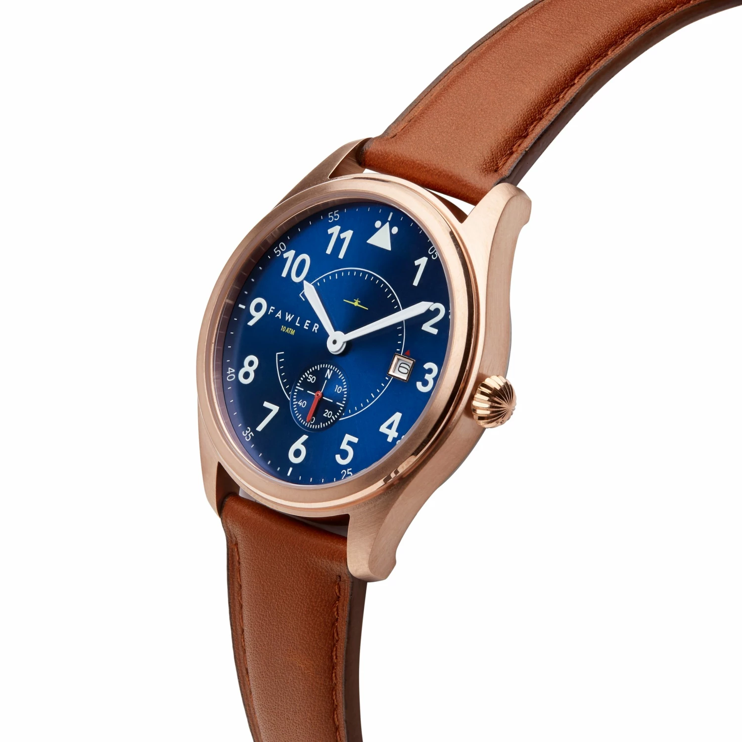 Bold, glow-in-the-dark markers (numbers, hands, and triangle) are set on a navy blue dial and make it easy to check the time with one glance. Interchangeable leather bands, with a quick-release system, and a rose-gold stainless steel case complete the design.