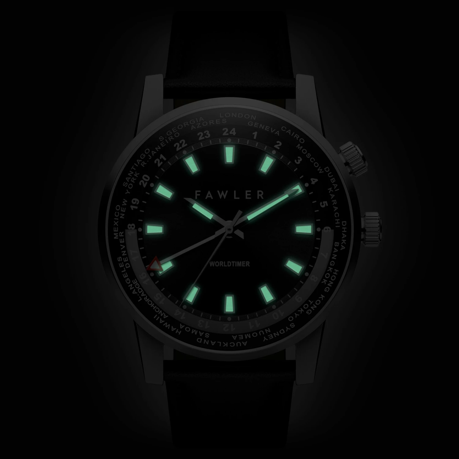 Classic silver-tone hands and indices indicate local time, both coated in high-grade lume so you can tell the time even in the dark. The GMT arrow hand indicates the time in the major cities dotted around the outer ring.