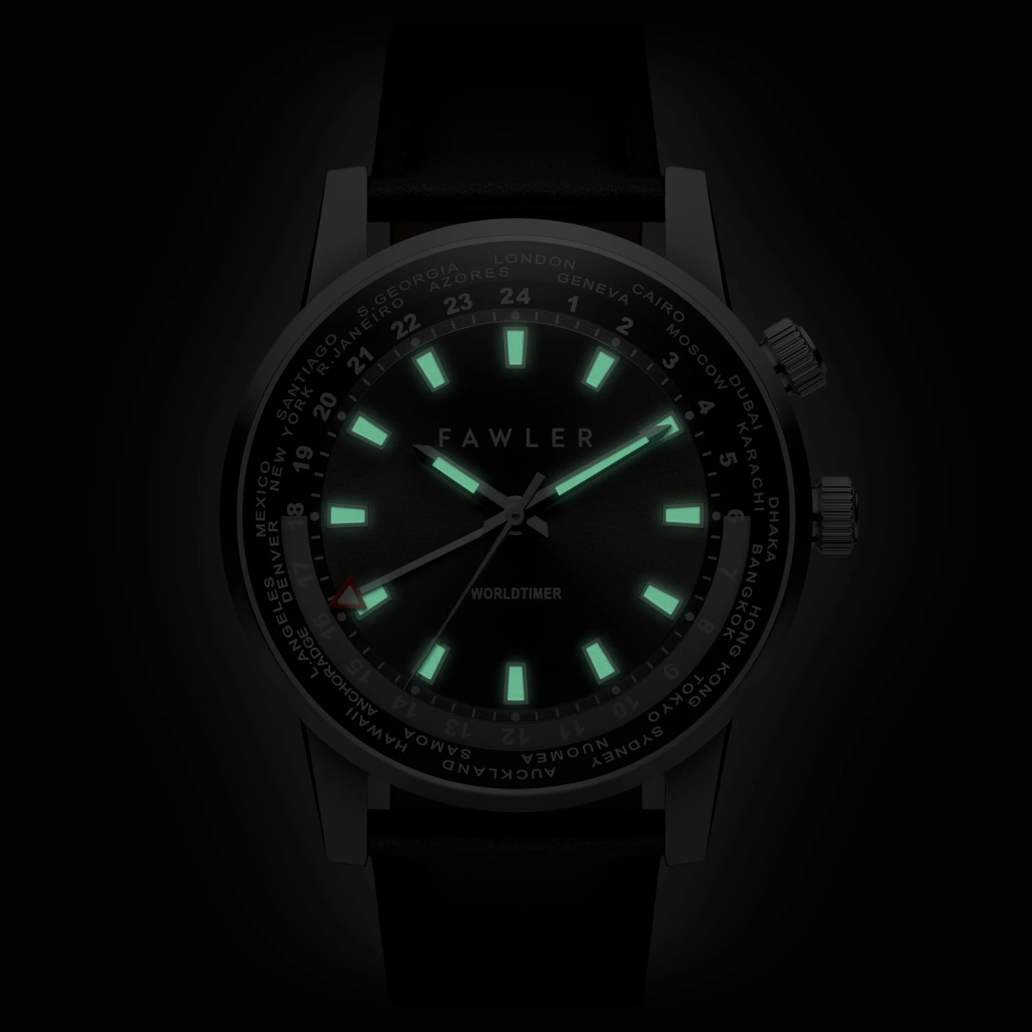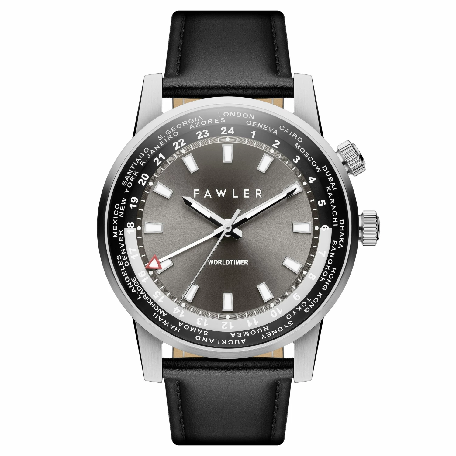 This menβs watch comes with a three-ring dial that displays both local and international time. Silver-tone hands indicate local time. A red GMT arrow hand indicates the time zones of major cities displayed on the outermost ring. The glow-in-the-dark hands and indices guarantee youβll be able to tell time, even in the darkest hours.