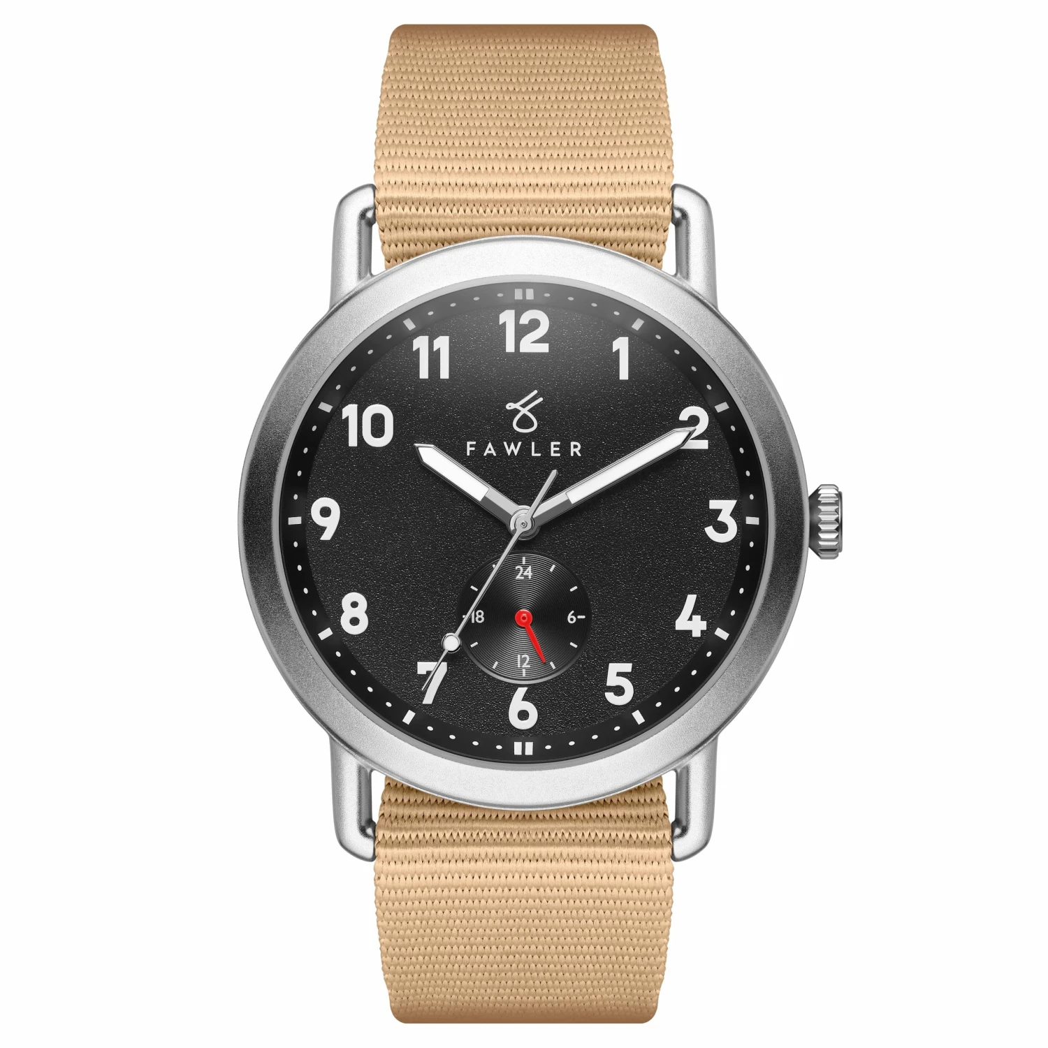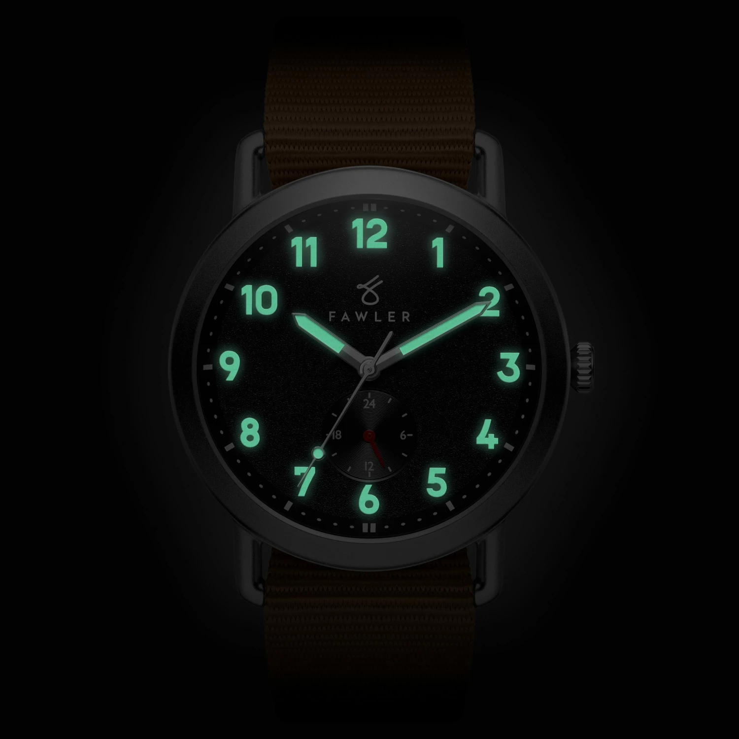 The crystal is made of single-domed mineral glass that protects it from bumps and scratches. Anti-reflective coating makes it easy to read at a glance, even when it’s bright outside. Japanese Seiko movement guarantees accuracy and the high-grade lume lets you tell the time, even when it’s dark. A discrete 24-hour subdial is positioned at 6 o’clock.