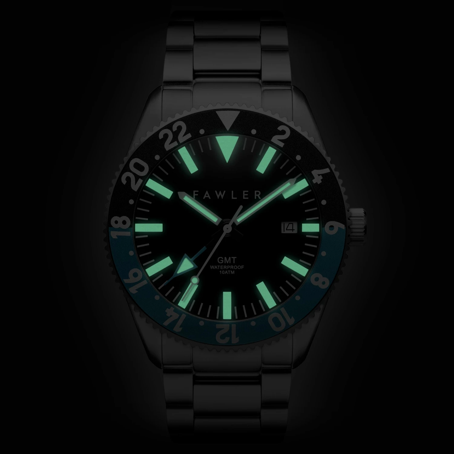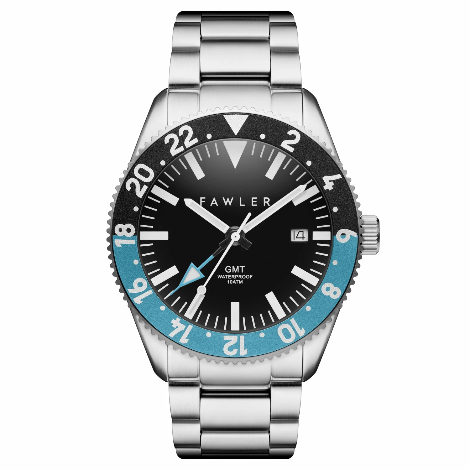 Encased in surgical-grade stainless steel, with a two-tone bezel with a 24-hour scale. Set the blue GMT hand at 12 o’clock and rotate the bezel to show a different time zone.
