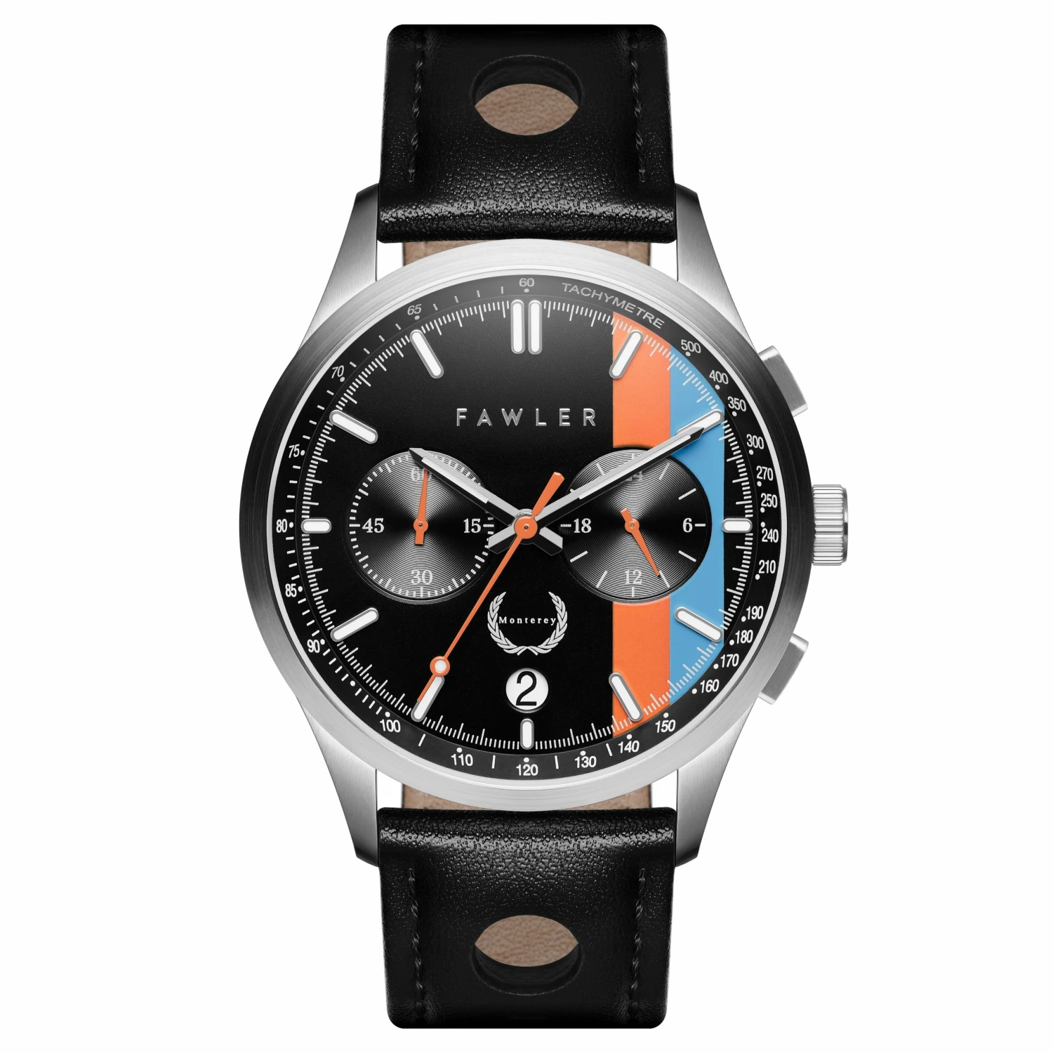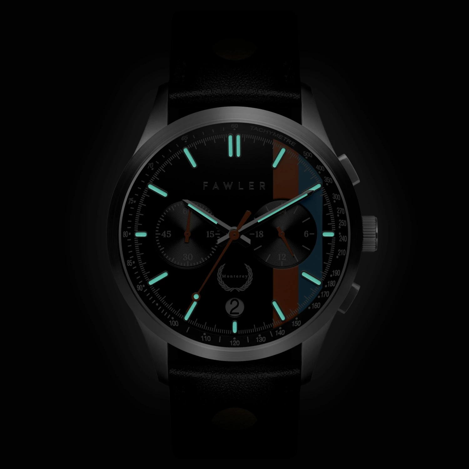 Start your engines. Tighten the strap on your classic racing watch. The Monterey is built for driving, and it can both time you and measure your speed. Its tactile crown and buttons are designed to be operated with gloves on.