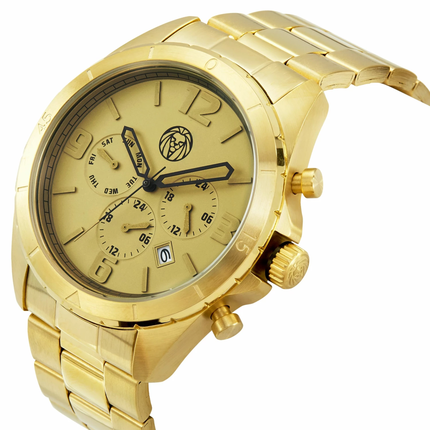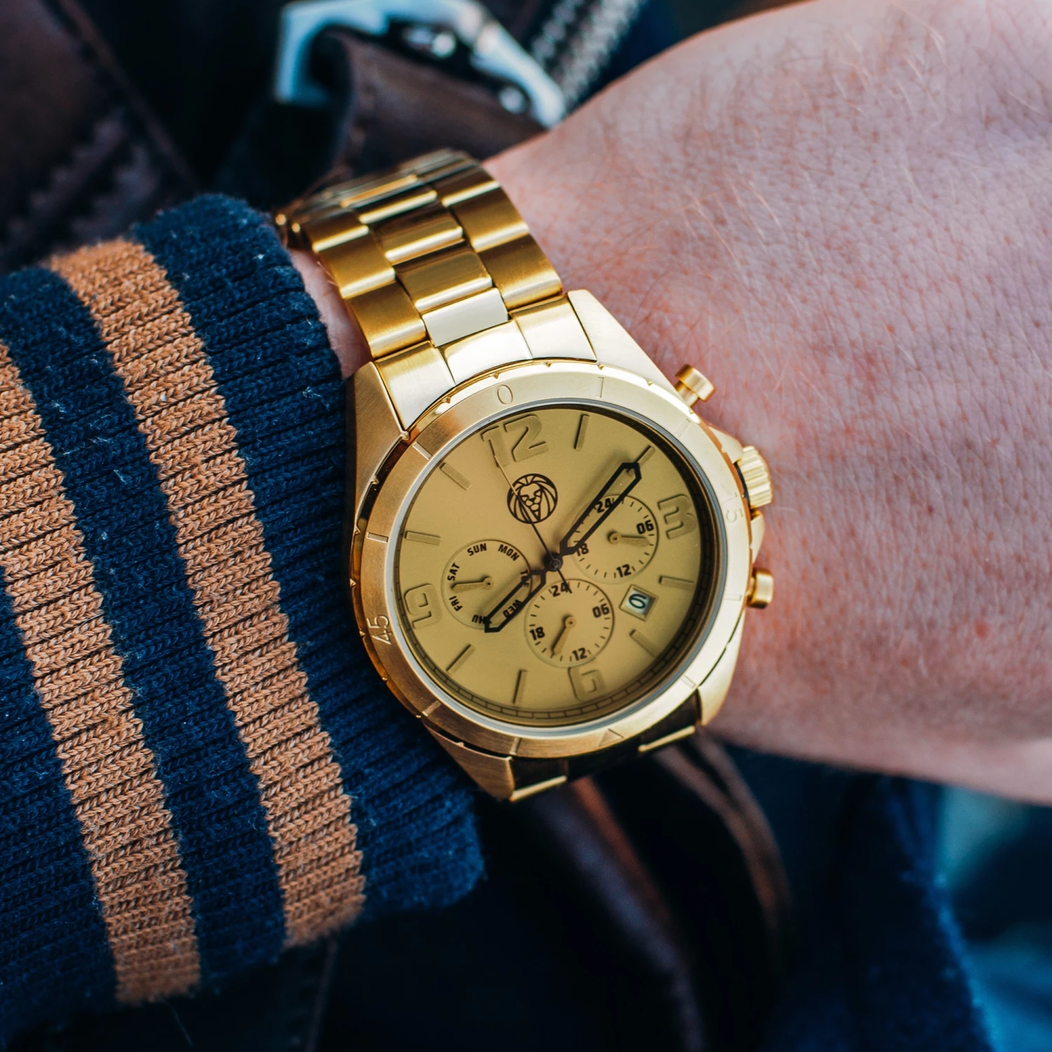 A chunky gold-toned watch made of solid stainless steel. The face includes three subdials that display time in a different zone, a day hand, and a 24 hour hand. A date window is built into the face.