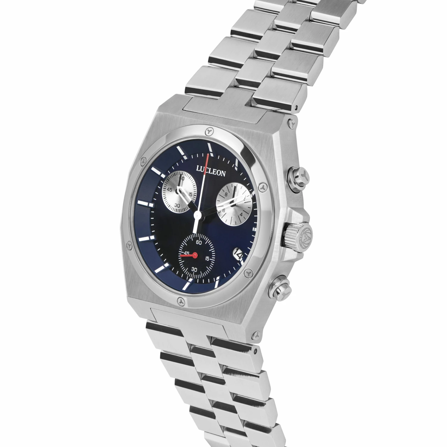 The blue dial features 3 stopwatch subdials and a discreet date window. Despite its impressive weight, the push-button deployant clasp keeps it securely on your wrist.