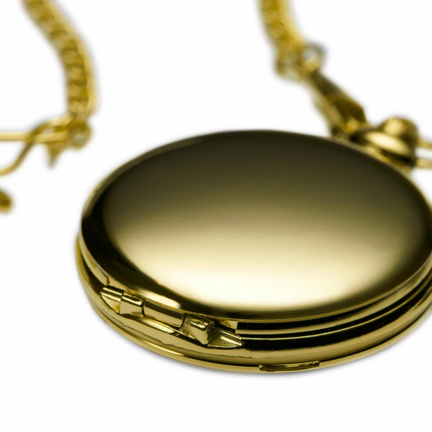 Opens and closes via a button, and hangs from a smart gold-toned chain so you can wear it in an authentic manner.
