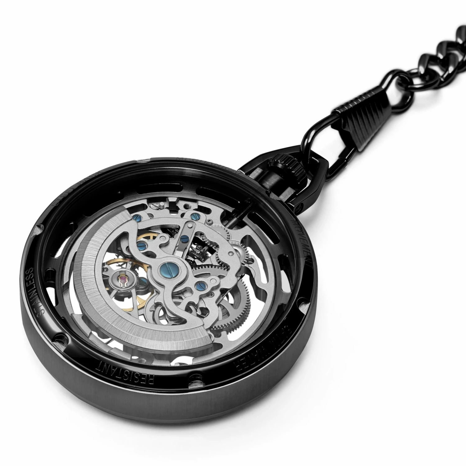 This open face pocket watch is fueled by an automatic mechanical movement thatβs visible behind the skeleton dial. From the back, watch the actual heart of your pocket watch track each passing moment.