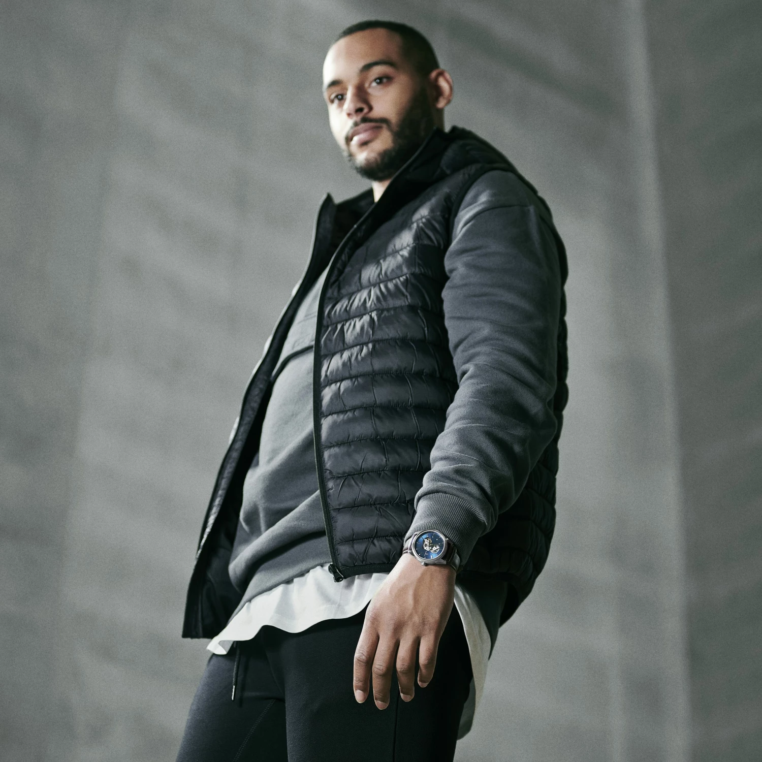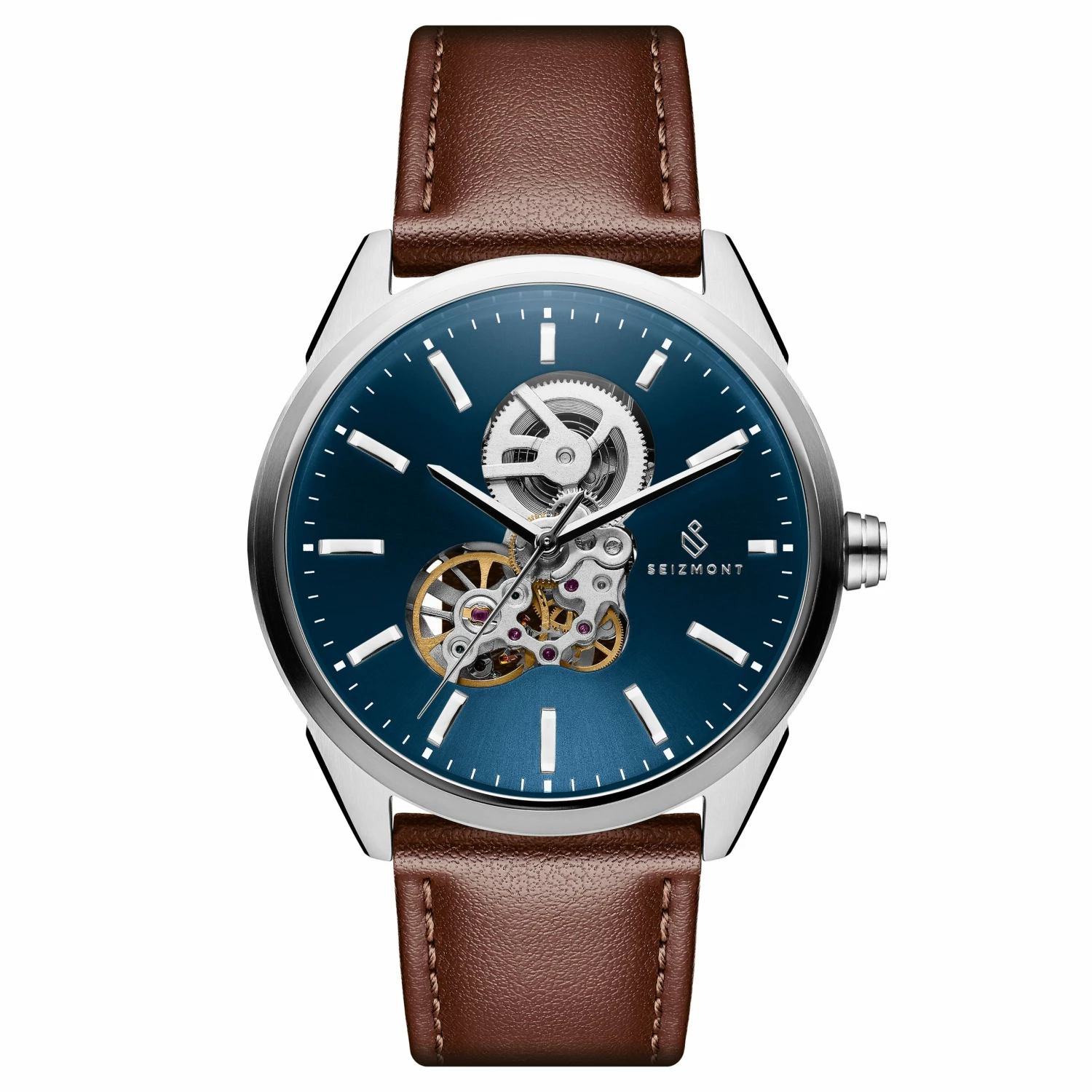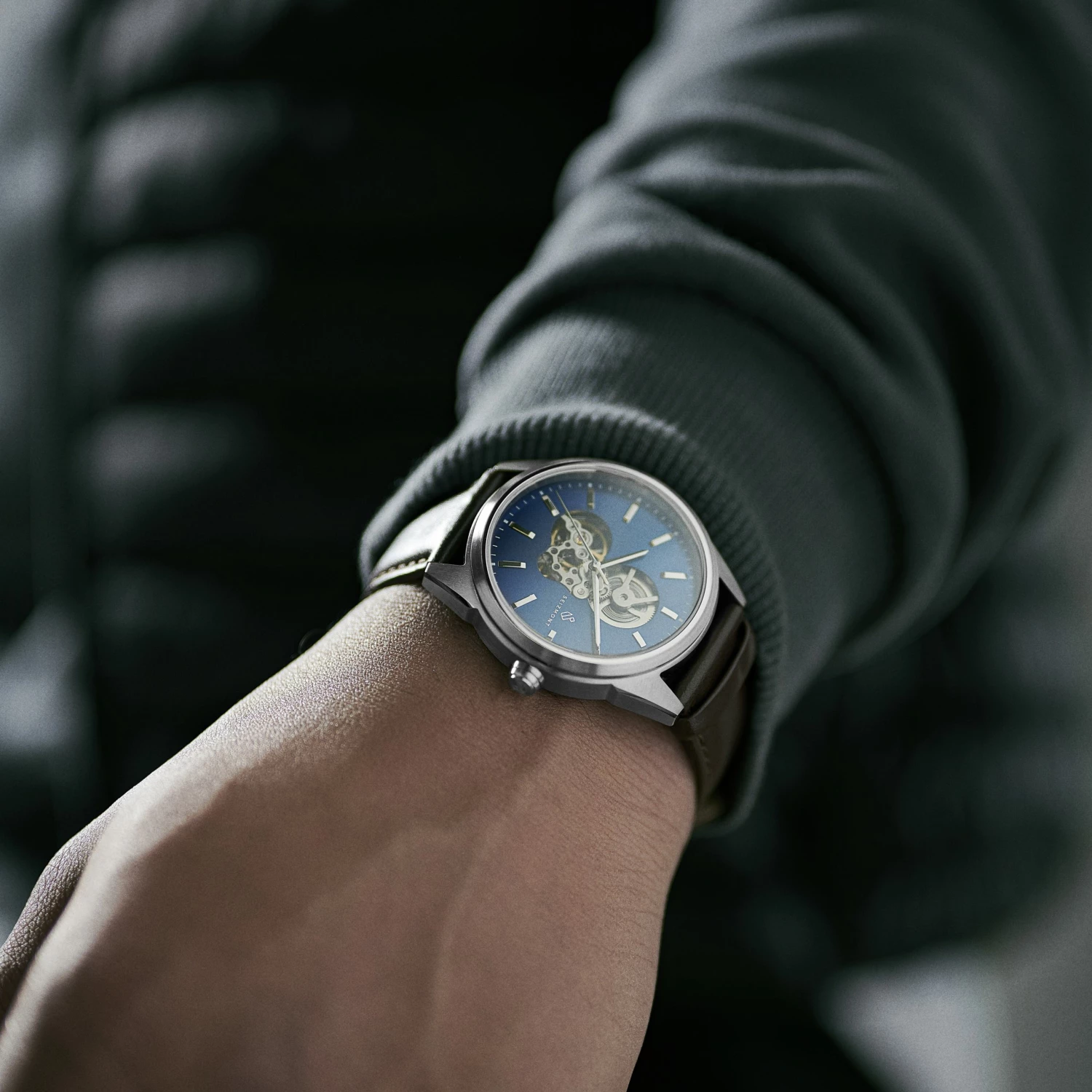 The Cor collectionโs signature dial elegantly exposes the watchโs beating heart. The mainspring, balance wheel, escapement, and pallet fork are on full display while the rest of the watch face is kept clean.