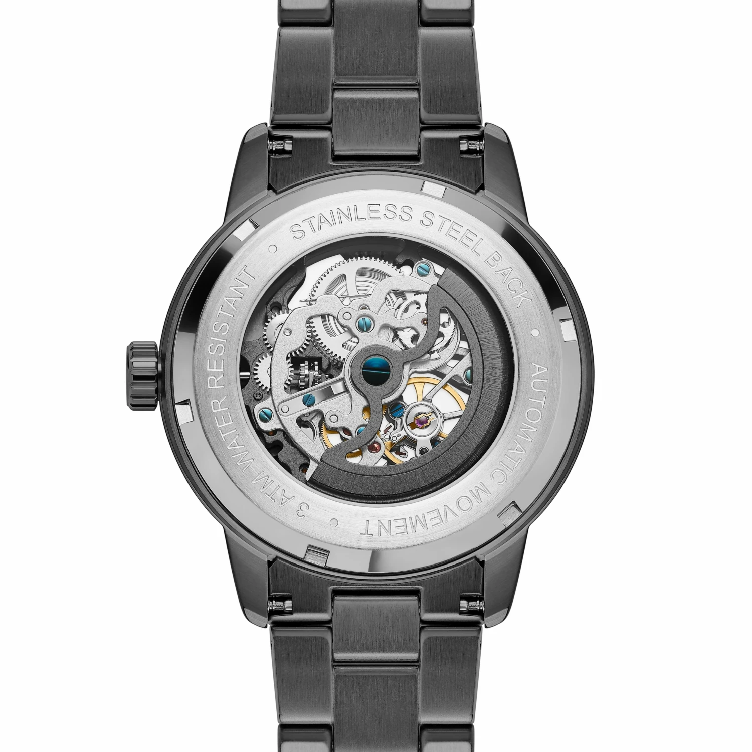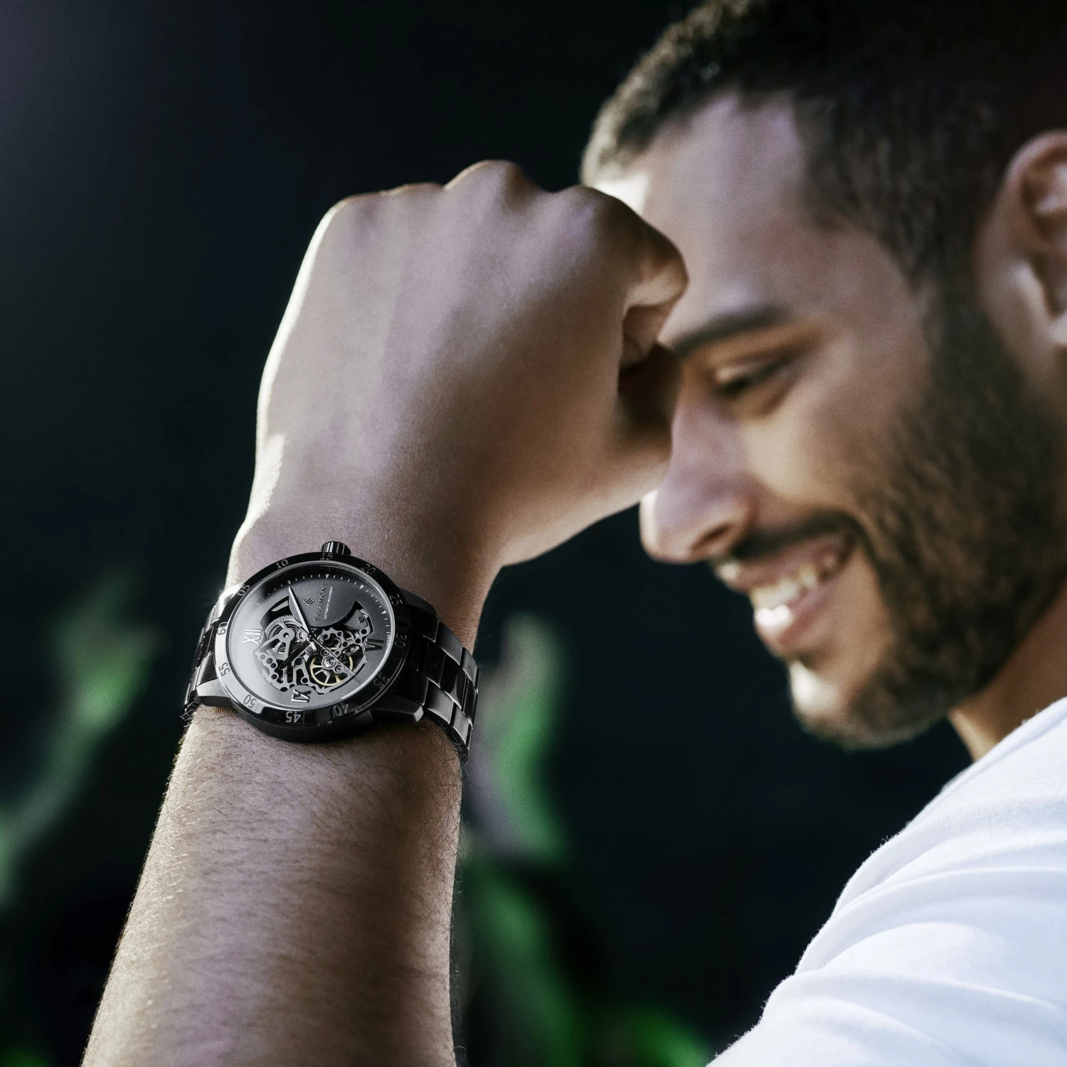 This limited edition Dante is made for the man of mystery. Gunmetal-gray case, strap, dial, and hands take a backseat to the watchβs ticking heart and the hypnotic dance within.