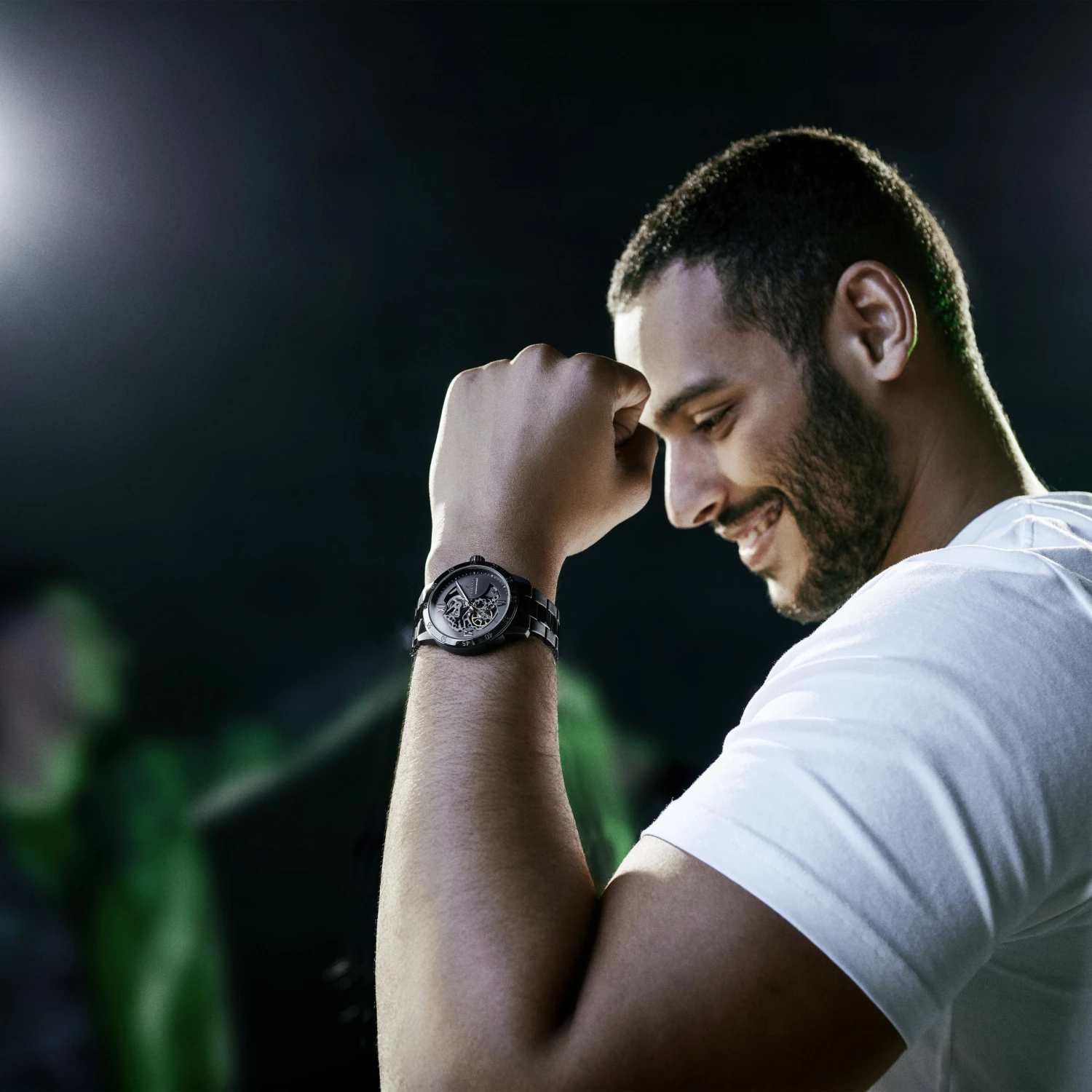 Its surgical-grade stainless steel construction and sapphire crystal make this menβs watch scratch and tarnish resistant. The transparent caseback and signature cut-out dial give you a front-row seat to its inner workings.