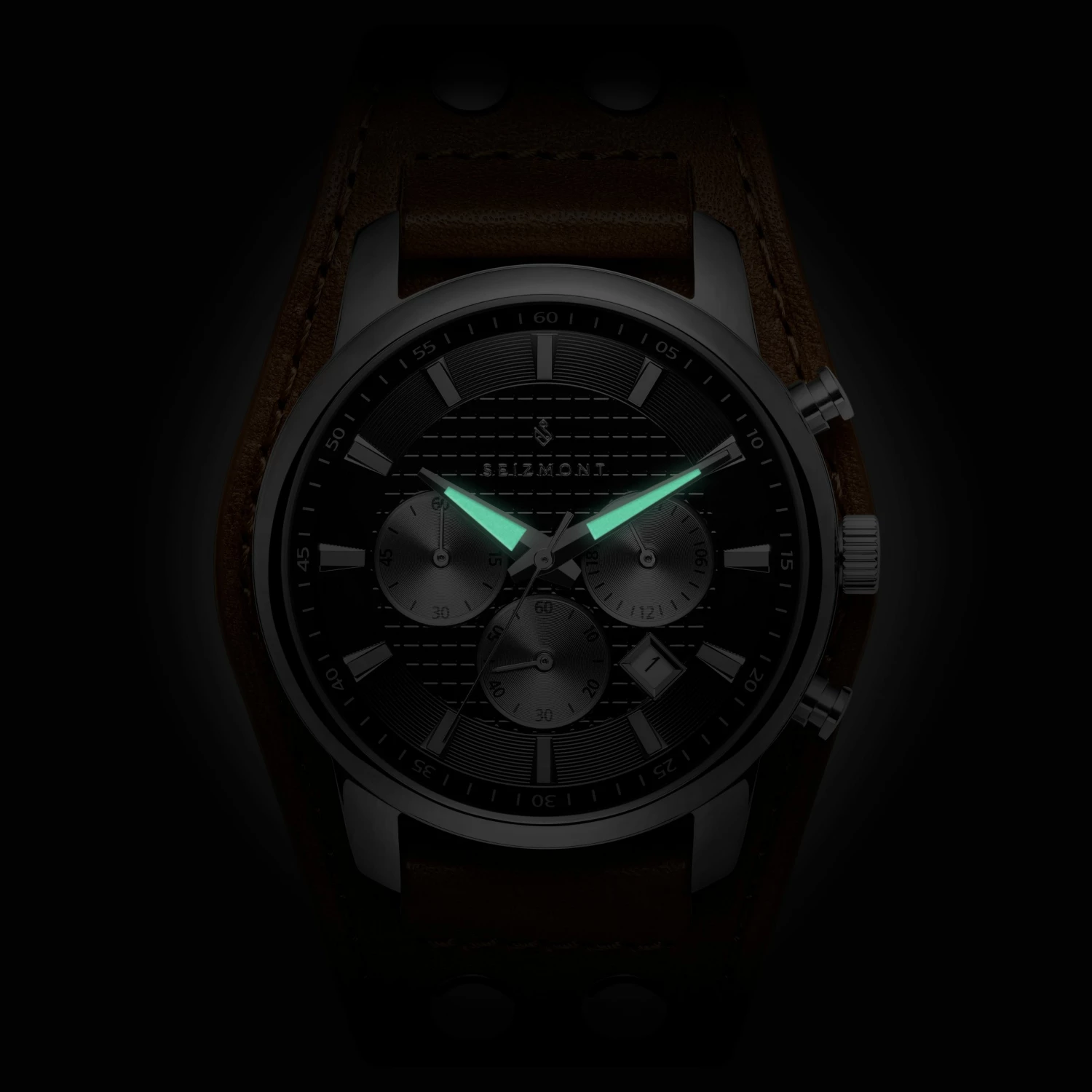 Inside the surgical-grade stainless steel case beats a reliable Japanese Miyota chronograph movement.
