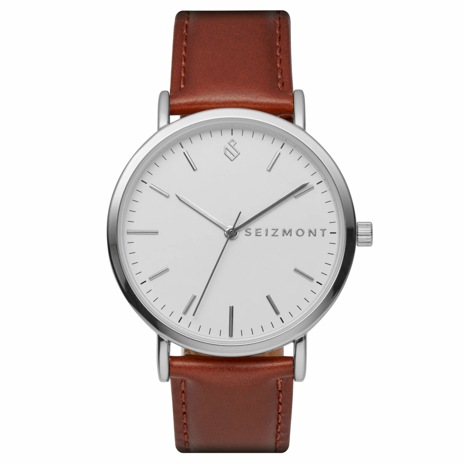 To align with the simple design and an astonishingly thin case, the logo is discreetly detailed on the white dial. Other details are in a matching and attractive silver tone. Boasts a brown leather strap for ease of pairing. Powered by Japanese movement.
