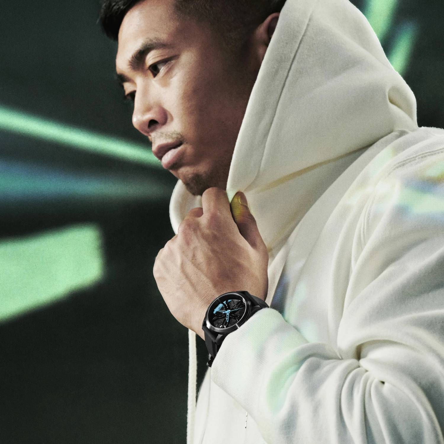 This race car inspired menβs watch features a brake disc dial with a blue caliper and hands. Its black rims are held in place by gunmetal grey bolts.