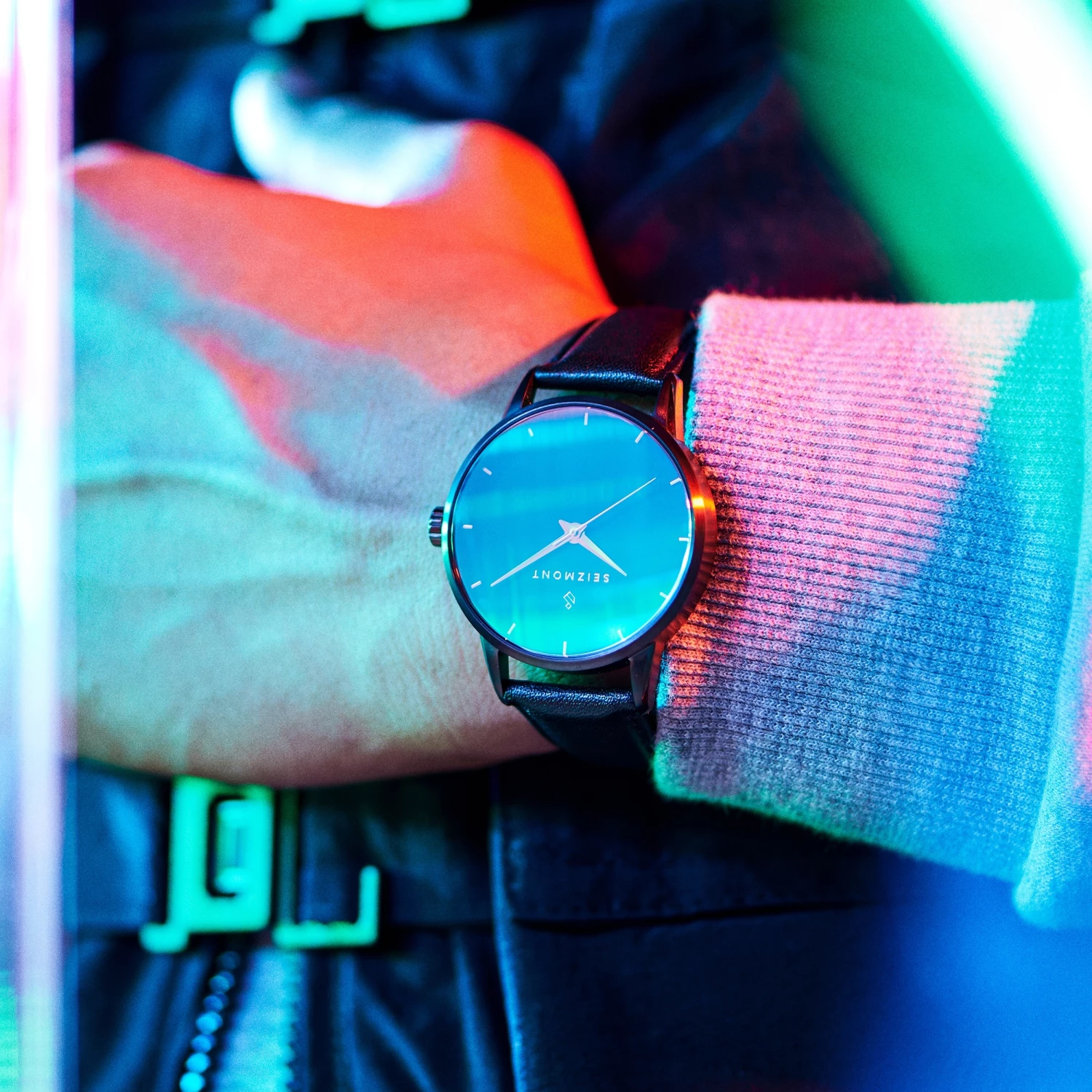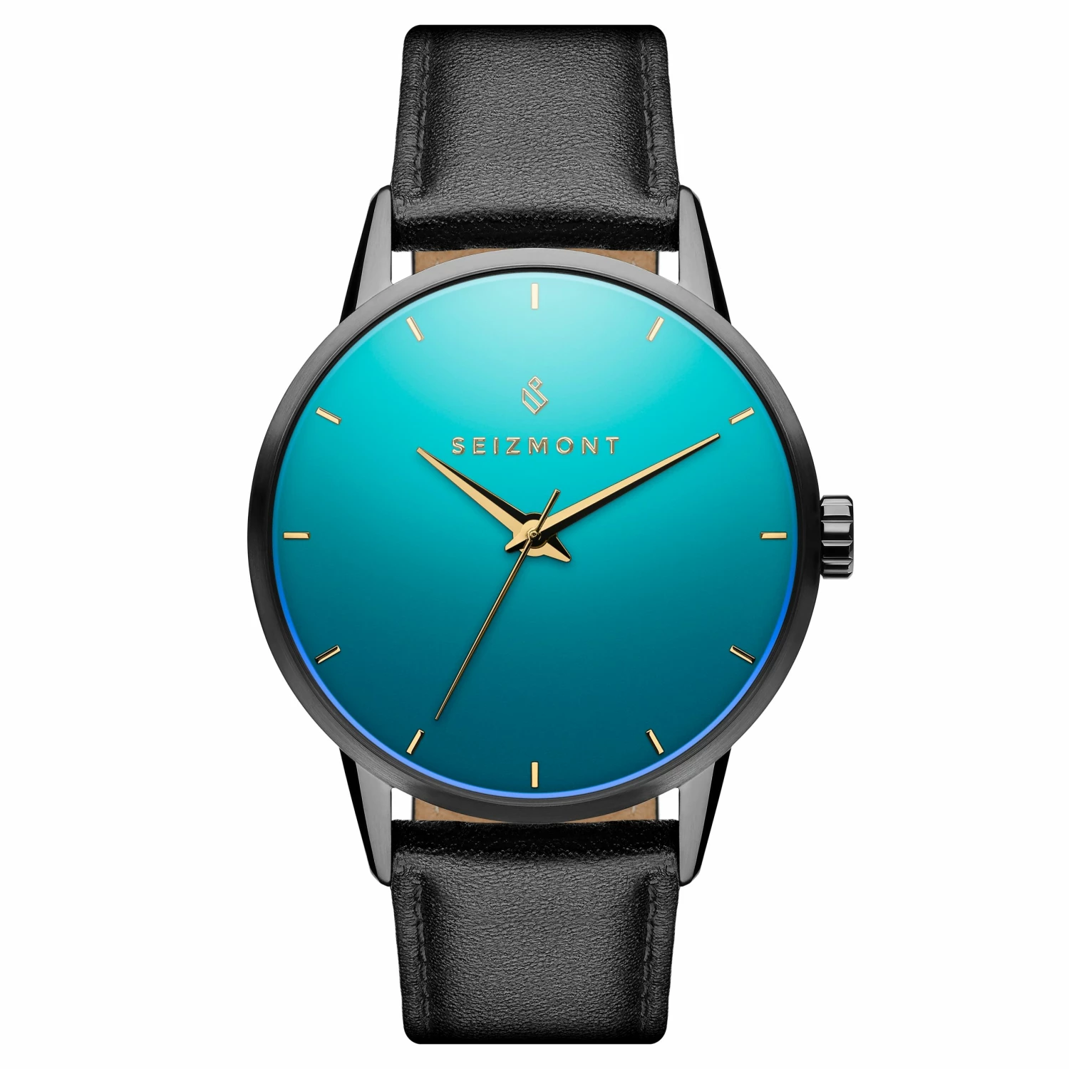 Its brushed, gunmetal grey, surgical-grade stainless steel case carries a reliable Japanese Miyota movement. The black dial proudly carries the Seizmont logo and features gold-tone indices and hands.