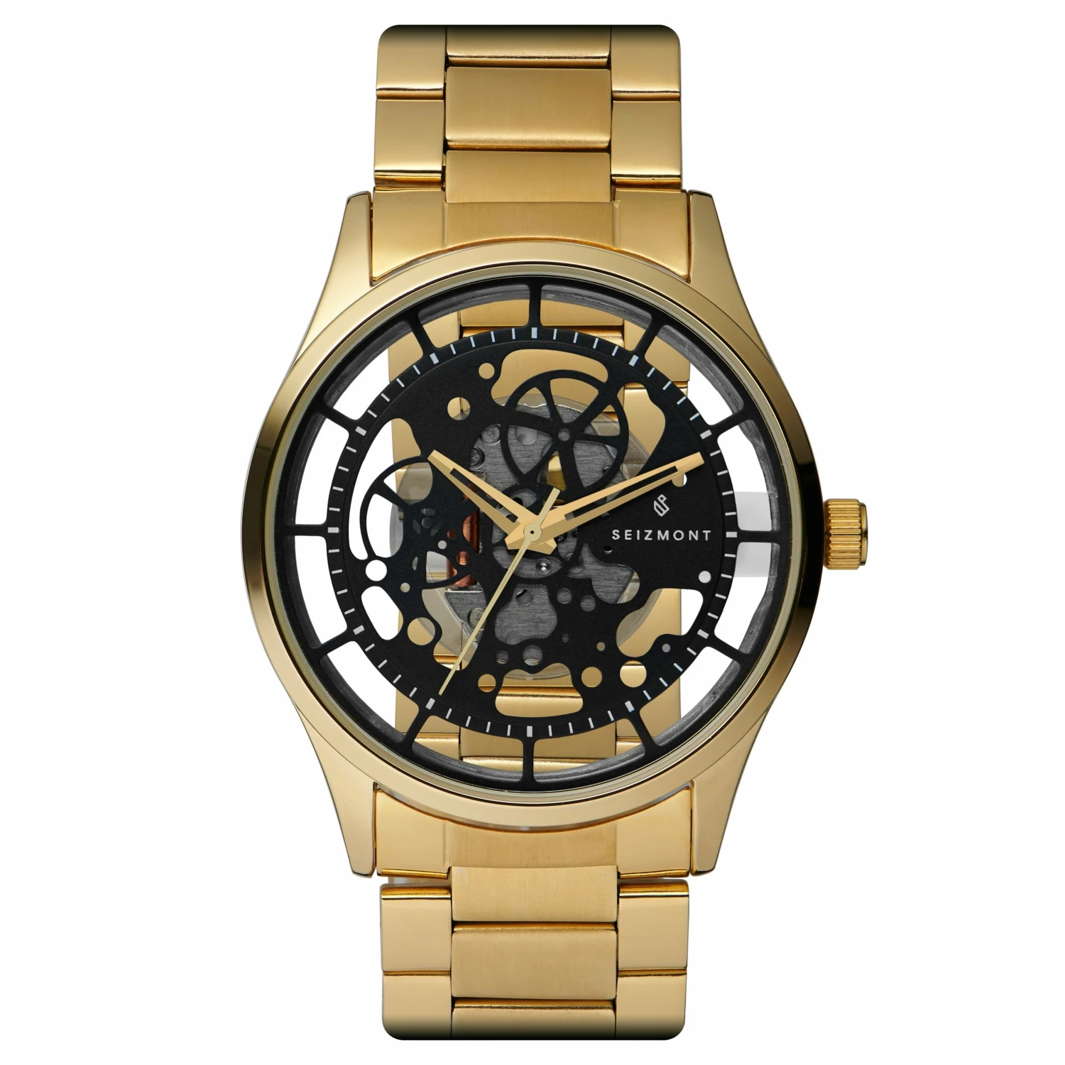 Itβs the skeleton dial that makes this gold-tone watch for men a statement piece. Handsomely constructed in gold-tone metal. Features a black dial and transparent back.