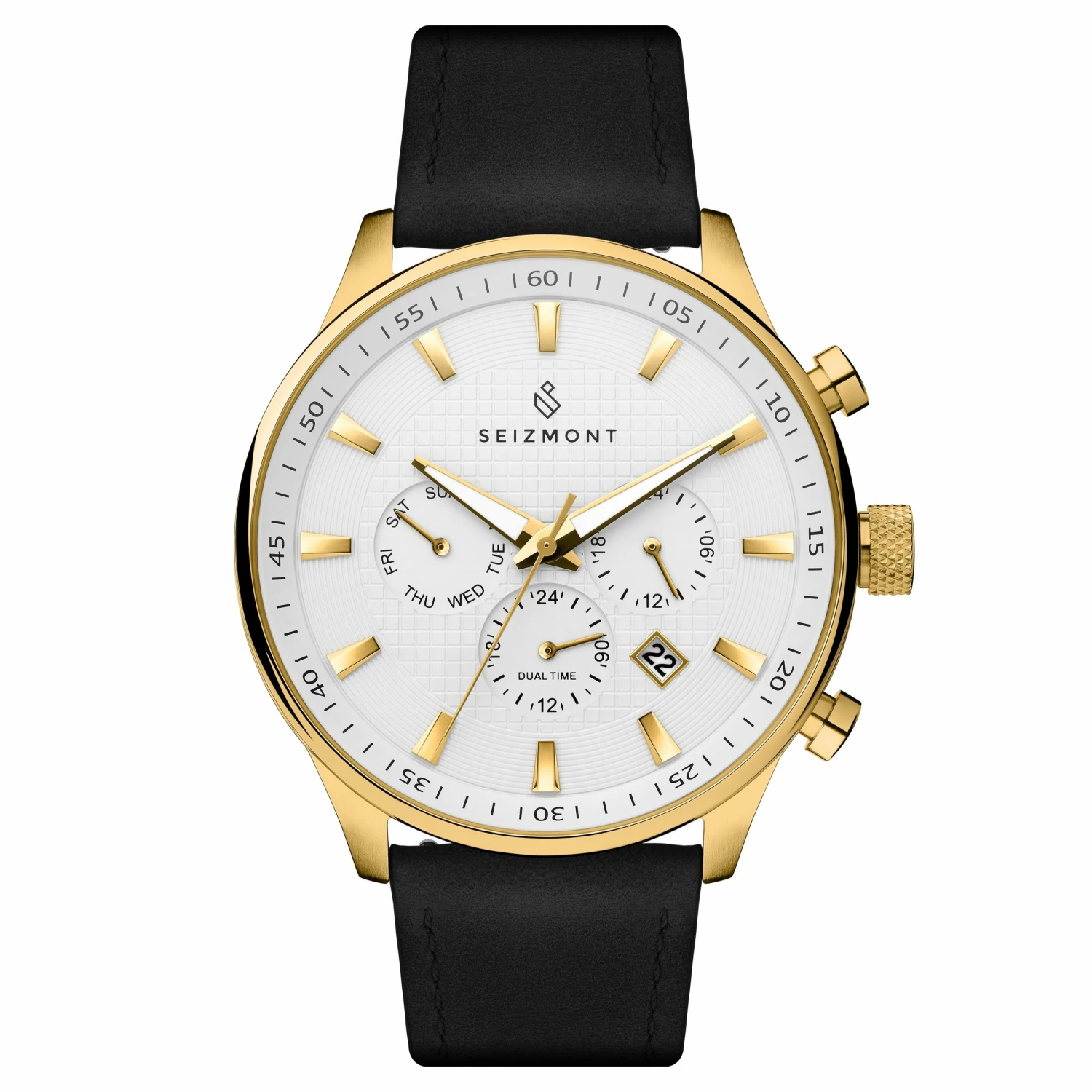 This is a gorgeous timepiece for men, designed by Seizmont in Denmark with careful attention to detail. If you look closely, youβll see concentric circles and a grid pattern on the white dial. Framed by gold-toned bezel and lugs, the black leather strap, easily interchangeable, lends it a nice, stylish contrast.